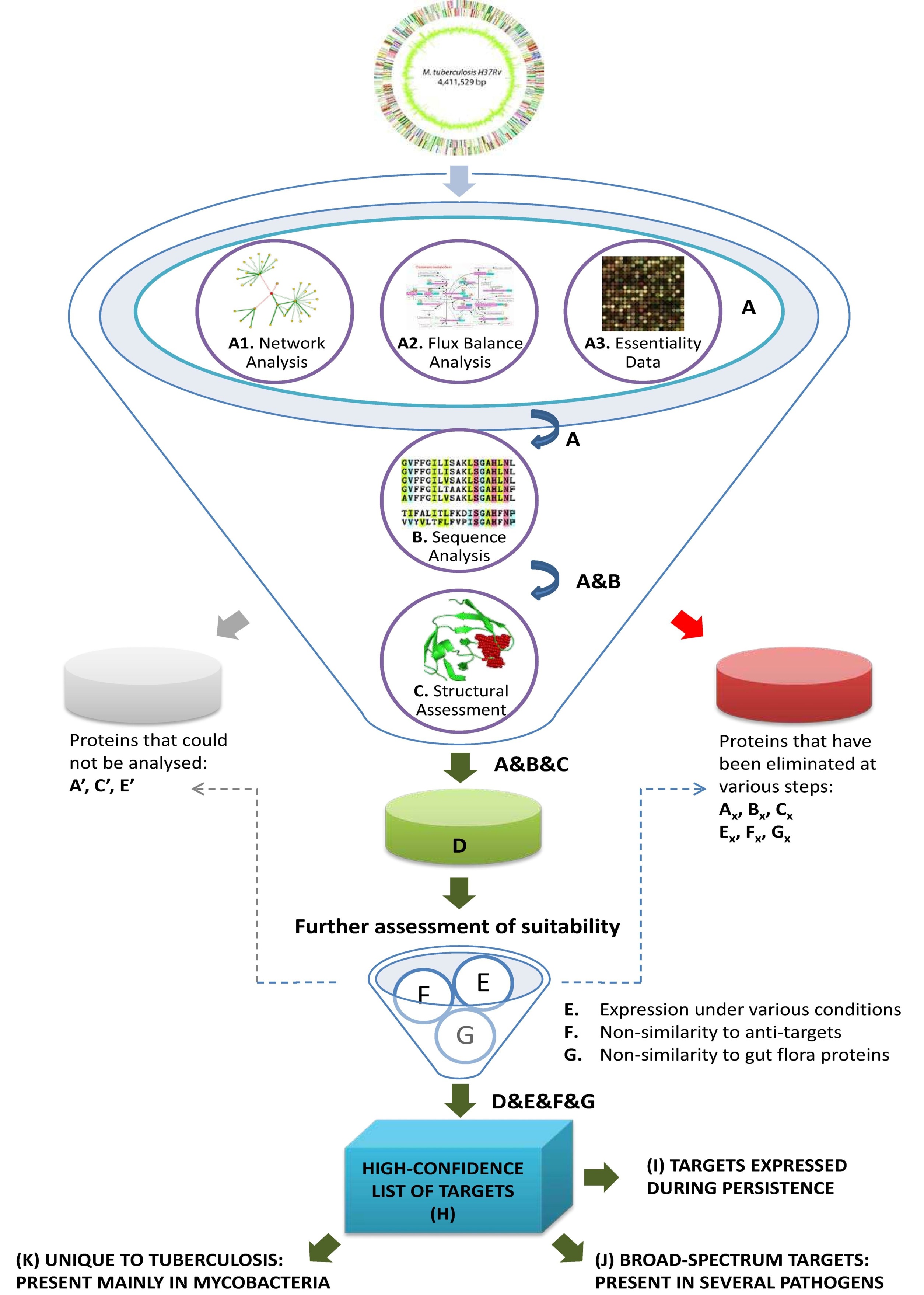 A comprehensive target identification study by integrating reactome, interactome analyses, sequence and novel structure based druggability analyses that has resulted in the identification of about 451 high confidence drug targets. A novel druggability assessment step is included in this. For the identified targets, Lead identification through structural analysis, molecular modeling, ligand docking and virtual screening, ab-initio design guided by interaction fingerprinting is also carried out.