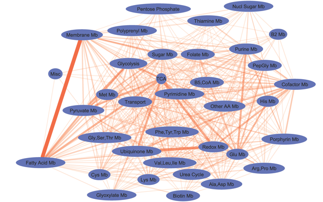 A major part of metabolism in Mtb, as captured by ~1000 biochemical conversions, has been modeled and simulated using stoichiometric methods, which has provided insights about relative importance of different reactions and possible metabolism shifts under different perturbations such as gene knock-outs.